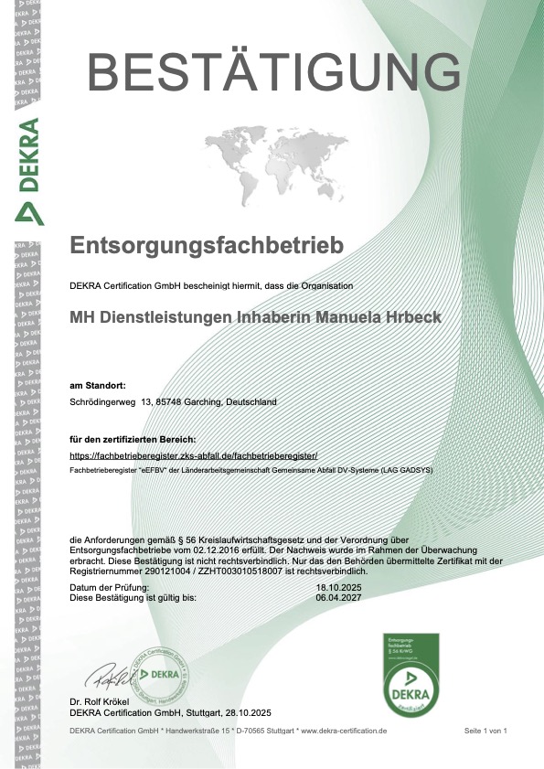Jeder Auftraggeber für Schutt- und Müllentsorgung ist dafür verantwortlich, dass das beauftragte Entsorgungsunternehmen einerseits befähigt ist und andererseits alle Aufgaben im Rahmen der umweltrechlichen Vorschriften erfolgt.Dafür benötigt der Entsorger gemäss § 56 KrW-/AbfG eine Zertifizierung. Diese Zertifizierung muss in regelmässigen Abständen erneuert werden. Das bedeutet, die Betriebe werden regelmässig und streng überwacht. Das schulden wir schon unserer Umwelt.
